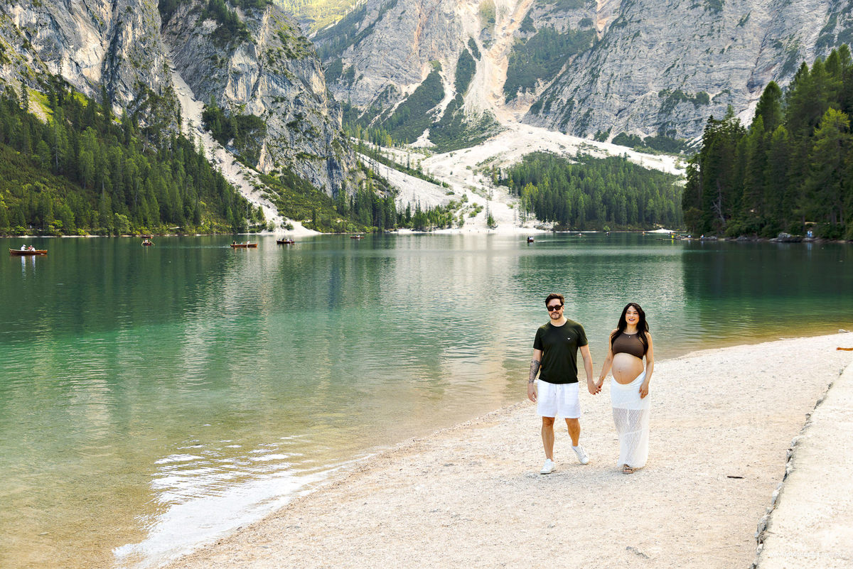 Fotografia e filmagem na Itália no Lago di Braies de ensaio de Gestante com fotógrafo brasileiro